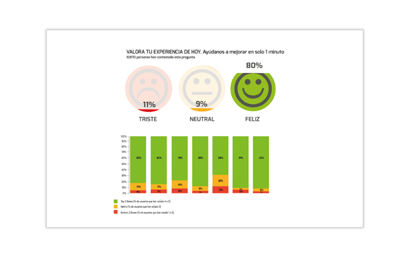 Es primordial tener claro que en una encuesta de satisfacción no podemos preguntar únicamente por una valoración del servicio. Necesitamos saber qué hay detrás de las caritas. Cuáles son los motivos de insatisfacción que existen en los clientes, cómo valoran aspectos más concretos del servicio, darles la oportunidad de hablarnos y decirnos qué mejorarían de la marca o servicio. Paralelamente a este proceso, los resultados puedes visualizarlos y analizarlos en una página de análisis de datos en tiempo real.